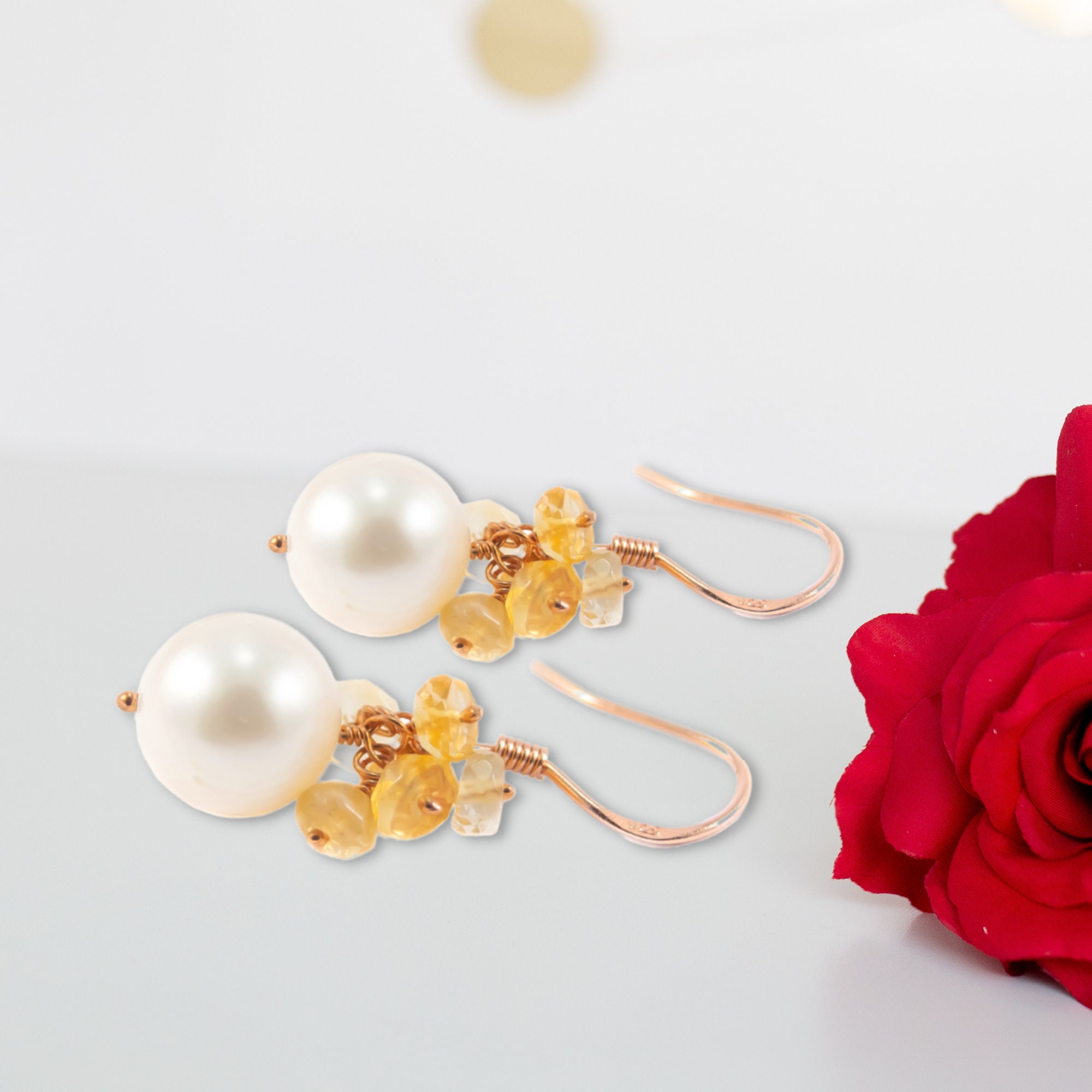 Dainty Citrine Cluster Real Pearl Earrings Fresh Water Pearls Etsy